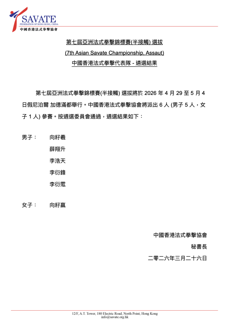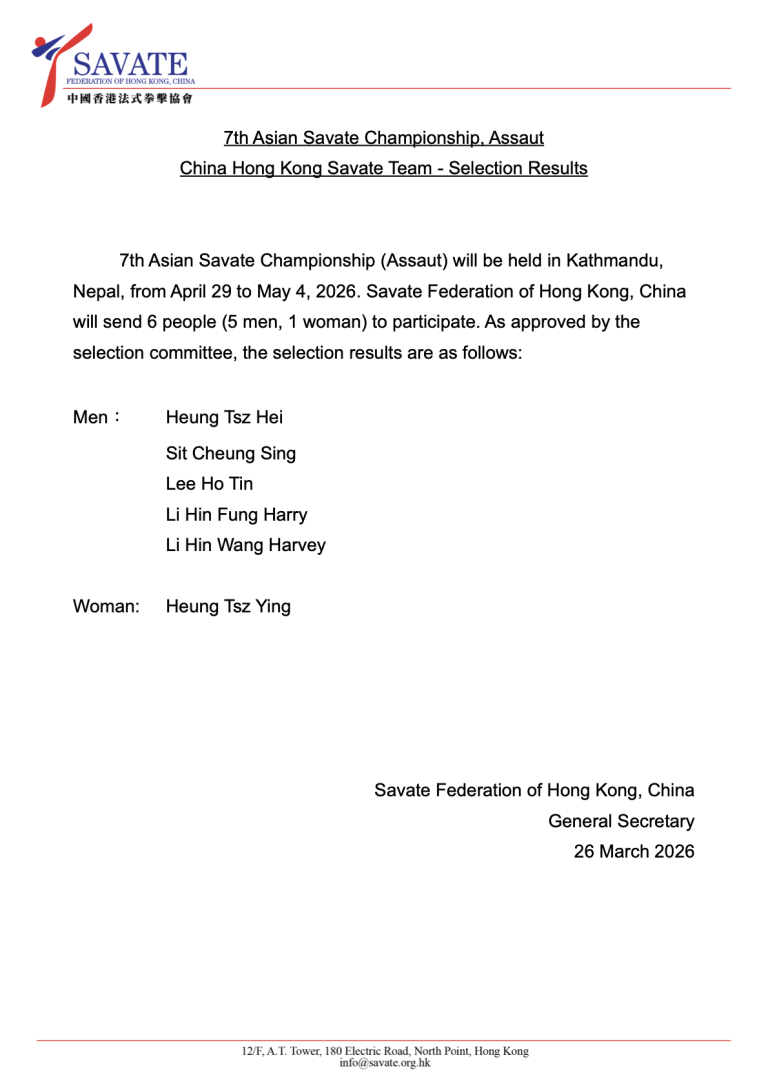 第七屆法式拳擊亞洲錦標賽運動員選拔 - 結果公佈
